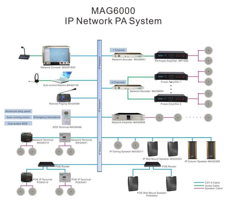 MAG6588 series digital intelligent paging station is a TCP/IP based network Hi-Fi paging station and can be used anywhere with network access. It can realize control on 1,000 zones based paginging and is featured by the high stability of traditional paging stations as well as reliable operation and low fault rate. Signals are transmitted in digital form and intelligent control is realized. The system provides 7 inches LCD true color display/touch screen as well as graphic and user-friendly operation interface. In addition, the system provides auxiliary input/output channels for extension of local audio source and amplification functions. The system integrates players developed independently by our company to realize local monitoring on host programs.